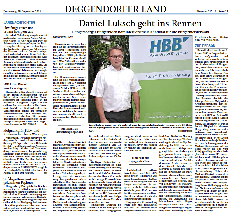 Am gestrigen Sonntag den 14.09.2025 fand die Mitgliederversammlung für die Wahl des Bürgermeisterkandidaten des Hengersberger Bürgerblocks (HBB) im Gasthaus zum Bayerischen Wirt statt.